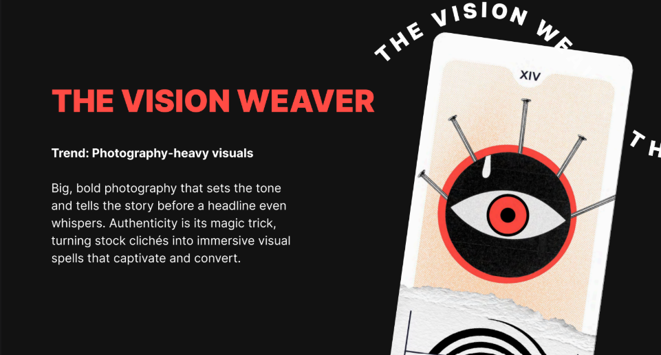 Logan: Yeah, that makes a lot of sense, Paul. Lovely. Okay, we need to keep moving. Briefly, in terms of the benefits of sans versus serif, we’ve touched on some of these points already. Sans fonts have cleaner, simpler letterforms, and that typically makes them easier to parse quickly. They typically scale well, again depending on the font, so they can stay legible. Where we see serif fonts having more advantages is in longer form print reading, and serifs can help with eye fatigue when going from letter to letter. Alright, moving right along. The next trend we have is the Vision Weaver, or photography-heavy visuals.