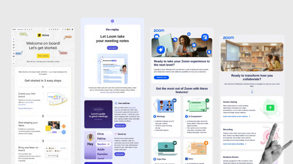This is a particular trend I notice—sub-trends too. In another presentation, I’ve noted Loom in particular: they’ve never met a corner they didn’t want to round off. They want everything child-safe and approachable. Miro and Zoom are up there as well. Let’s think about this. Rounded modular layouts: where do these elements not work? What makes them effective? How can we make this more accessible? Thoughts, feelings, compunctions?