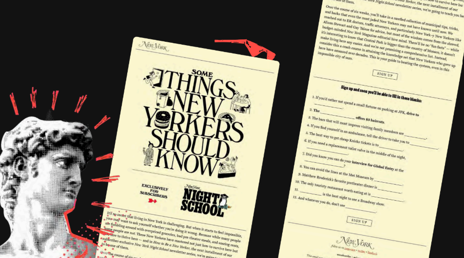 Of course, that plays to your own perceptual bias. So it’s important to engage with folks who have the disabilities you’re trying to reach, to make sure you’re taking them into account as well. That’s why I send all of my emails to Mark to hold out at arm’s length and read and go out from there. That’s good. I think we’ve got some good points here. And then in terms of how to stand out, I think there’s something we can talk about. Here’s an example from New York, not the city but the publication, and they go entirely serif. I’m not telling anyone they should go entirely serif, that’s not it. If you go full serif, it really has to work with your brand. But in terms of pairing serif and sans fonts, that’s something I’ve seen work well. Do you all have any opinions about pairing those?