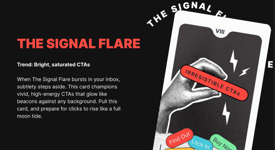 When the Signal Flare bursts in your inbox, subtlety steps aside. This card champions vivid, high-energy CTAs that glow like beacons against any background. Pull this card and prepare for clicks to rise like a full moon tide. So we have some lovely examples here of bright, saturated CTAs that tend to stand out like little neon beacons against these backgrounds here from Section and Stuf Fitness. Some good options here. Let’s dig into this a little bit. For these bright, saturated CTAs, do you all see any downsides? Are there ways we can make this more accessible? Does it all depend, like we almost inevitably answer about any question here?