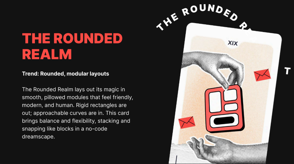 The Rounded Realm lays out its magic in smooth, pillowed modules that feel friendly, modern, and human. Rigid rectangles are out. Approachable curves are in. This card brings balance and flexibility, stacking and snapping like blocks in a no-code dreamscape. Let’s look at some examples for rounded modular layouts. I see this a lot with SaaS companies.