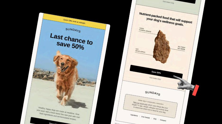 Well, in terms of how to stand out, you don’t have to go bright. This is a great example from Sundays, which—fun fact—we ran through our Beefree Smart Check and it came out perfectly. They made no mistakes.They made no mistakes. Just a nice black-and-cream or black-and-white palette can really stand out, especially when you’ve got brighter colors around and in the background. And it also doesn’t hurt to have a picture of a dog. If you can combine a reasonably colored CTA with a picture of your dog—again, that’s brand specific—that could help with the conversion rate. Also, for folks in the chat asking about answering questions in the Q&A: we will. I’m making sure we move through the content so we can address those at the end. Appreciate everyone’s patience. We will get to those questions.
