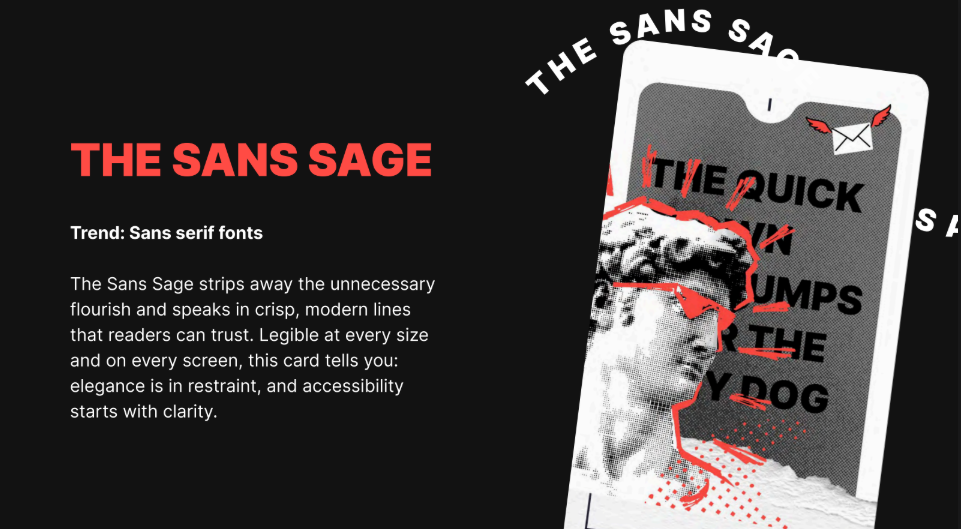 The Sans Sage strips away unnecessary flourishes and speaks in crisp, modern lines readers can trust. Legible at every size and on every screen, this card tells you elegance is in restraint and accessibility starts with clarity. Perhaps unsurprisingly, sans-serif fonts were one of the top design trends in terms of frequency across the examples we examined.