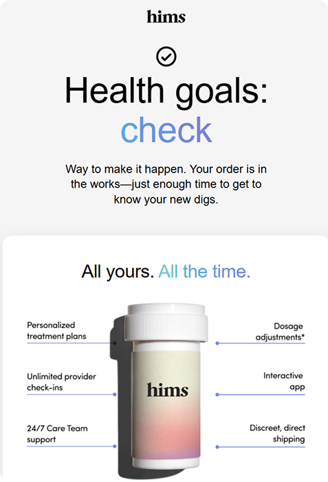 Julia Papanek: So this is our order confirmation email. It goes out to the customer right after they sign up for their first prescription order. This one specifically is for our mental health customers. We really try at the top to strike a balance between it feeling transactional while also welcoming them to the brand. We’re affirming the decision they’ve made with the headline copy. Below that, we reinforce it with some value props — all the benefits that come with their subscription. Then, of course, we include the transactional details — anything they might want to know about the order they’ve just made. At the bottom, there’s a module for help if they’re unsure where to go or have any questions. We try to make it super easy.