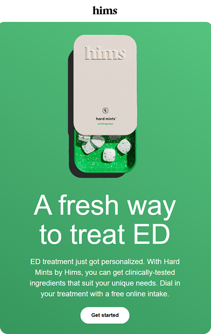 Julia Papanek: I love this email. It was a launch for our new Hard Mints product. I worked on the GIF with one of our motion designers, Carolyn Crenshaw. It was essential to demonstrate how the tin works—it’s one of the key differentiators. It’s not a typical ED pill; it’s a hard mint, so it’s more fun and playful. Showing the tin sliding open and revealing the mints was essential for the launch.